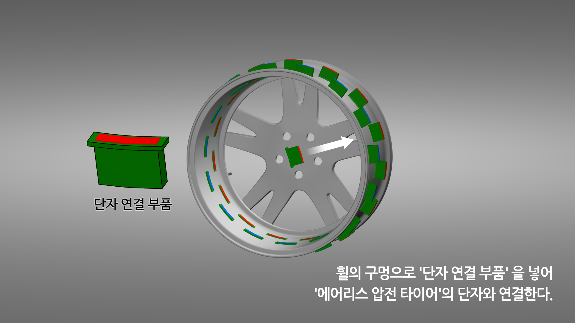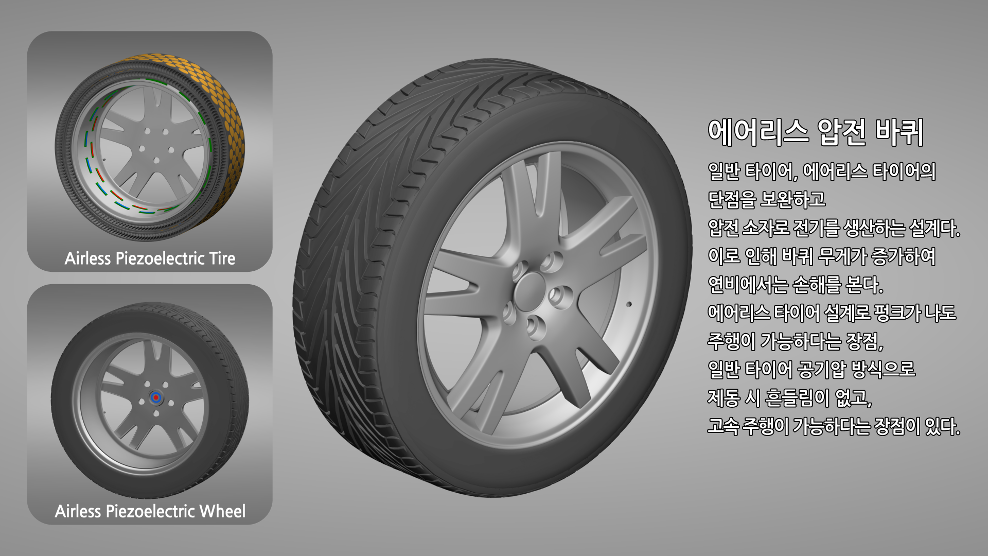 - 휠과 '에어리스 압전 타이어' 공간을 연결하는 부분에서 '튜브'로 설계하는 것이 승차감, 전체적인 바퀴의 구성에서 더 좋을 수 있다. 하지만 이 경우 타이어 교체 작업이 불편할 수 있다.