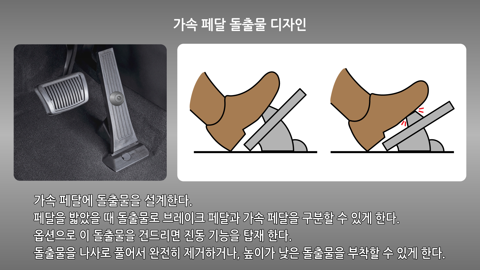 페달을 밟았을 때 돌출물로 브레이크 페달과 가속 페달을 구분할 수 있게 한다.